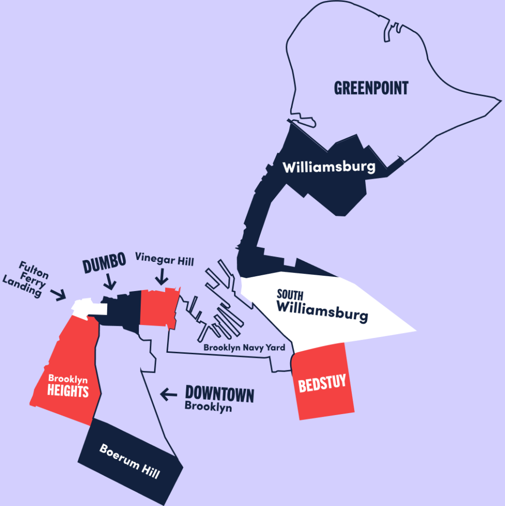 The 33rd Council District hugs the Brooklyn waterfront. From north to south, the district is comprised of the following neighborhoods: Greenpoint, the Northside, South Williamsburg, Bed-Stuy, the Brooklyn Navy Yard, Vinegar Hill, DUMBO, Fulton Ferry Landing, Brooklyn Heights, Willowtown, Downtown Brooklyn, and Boerum Hill.